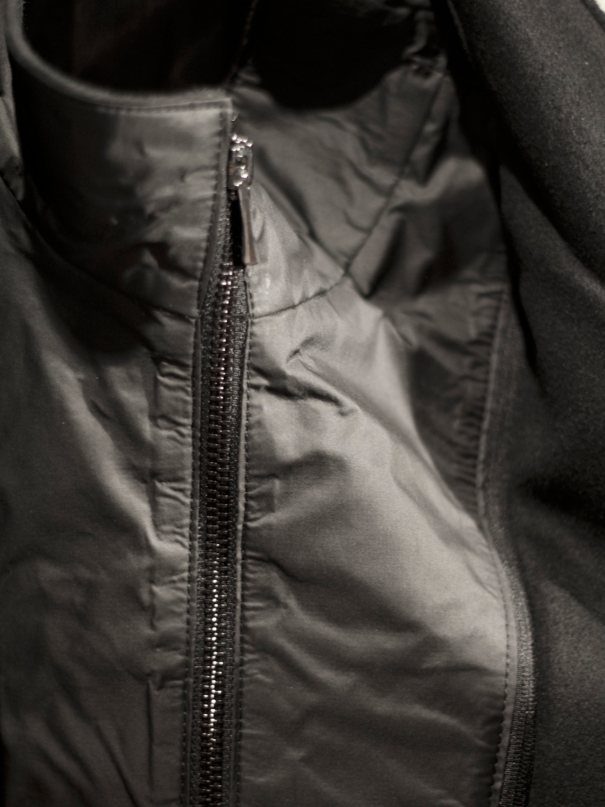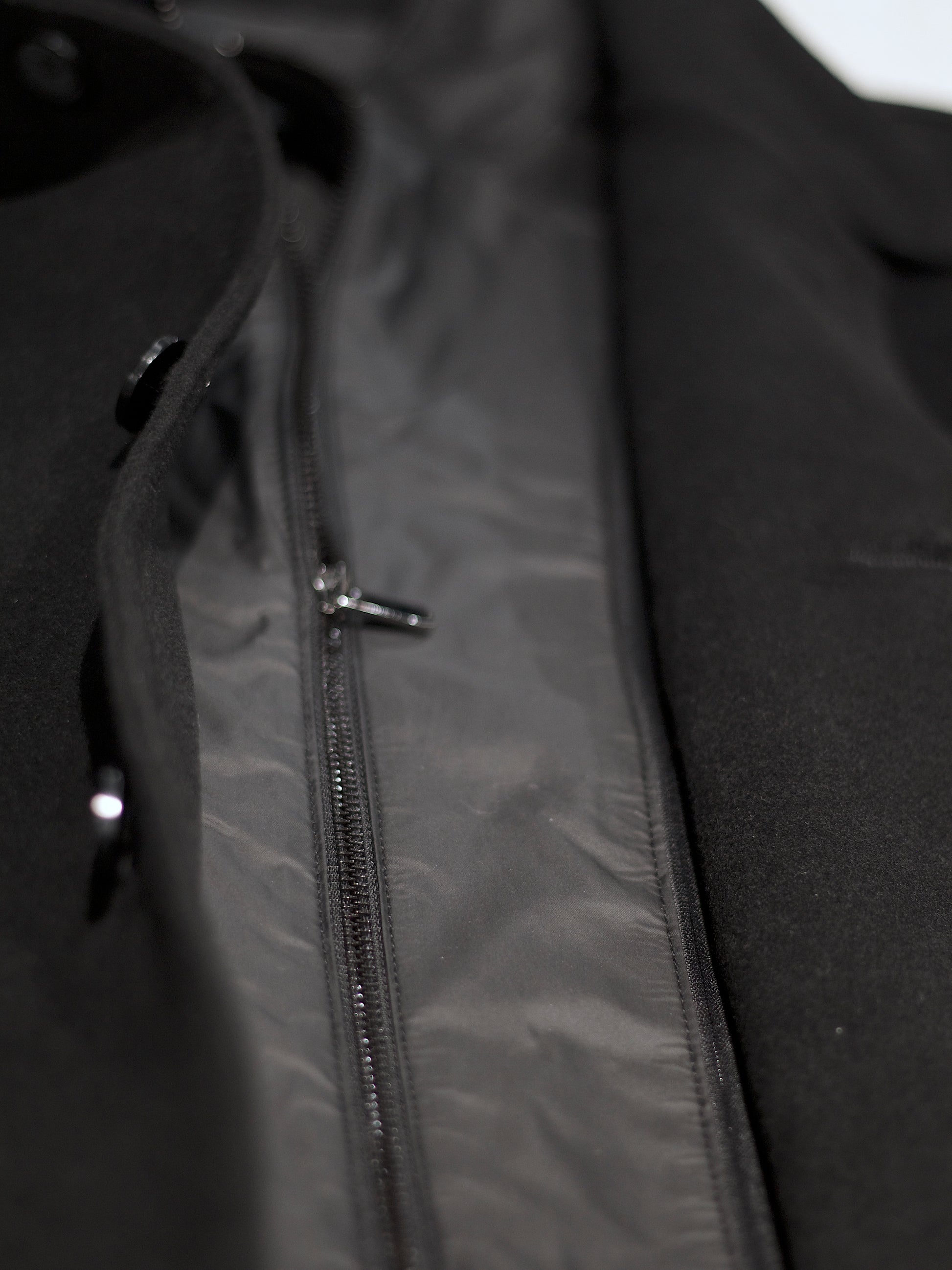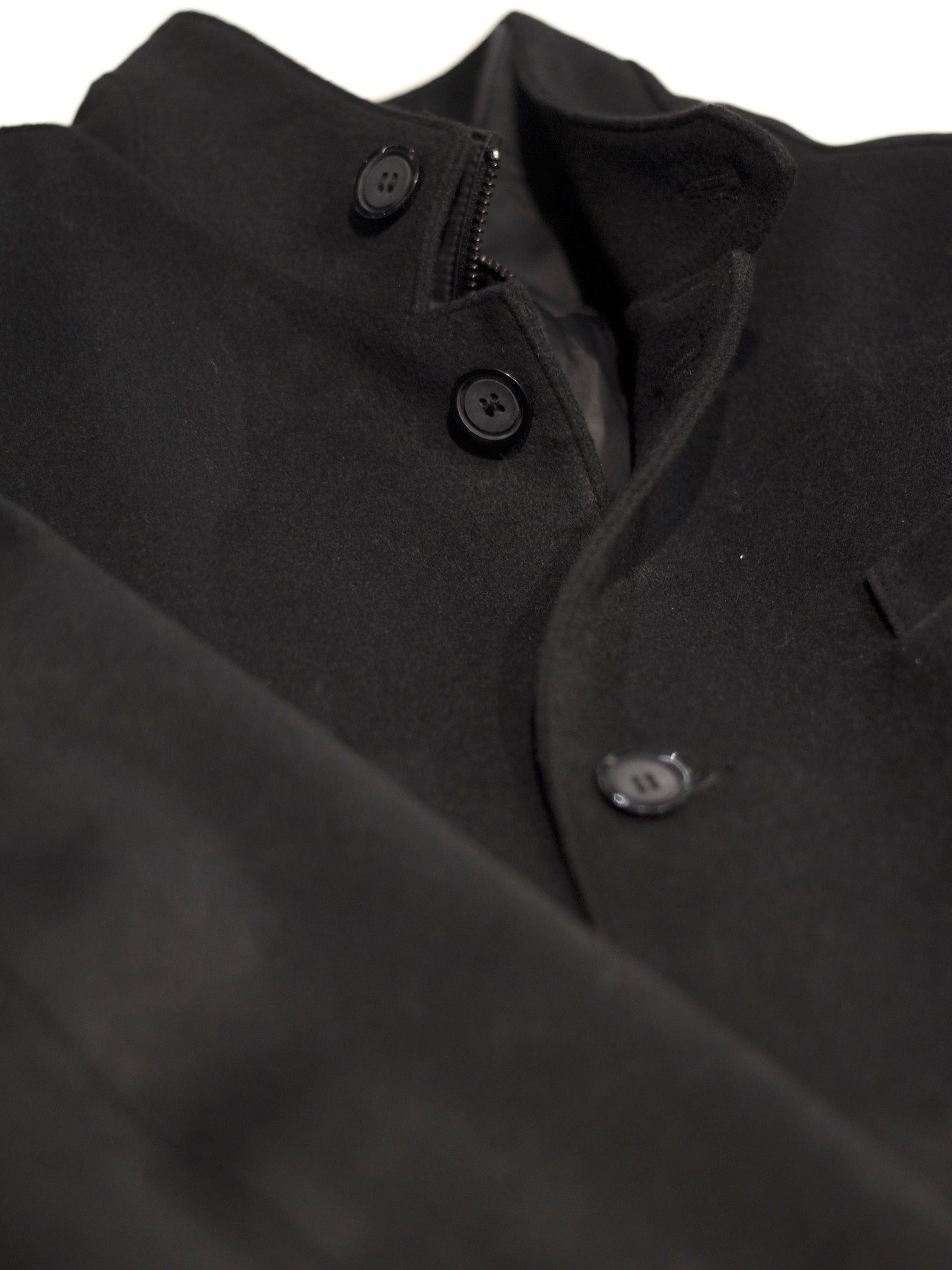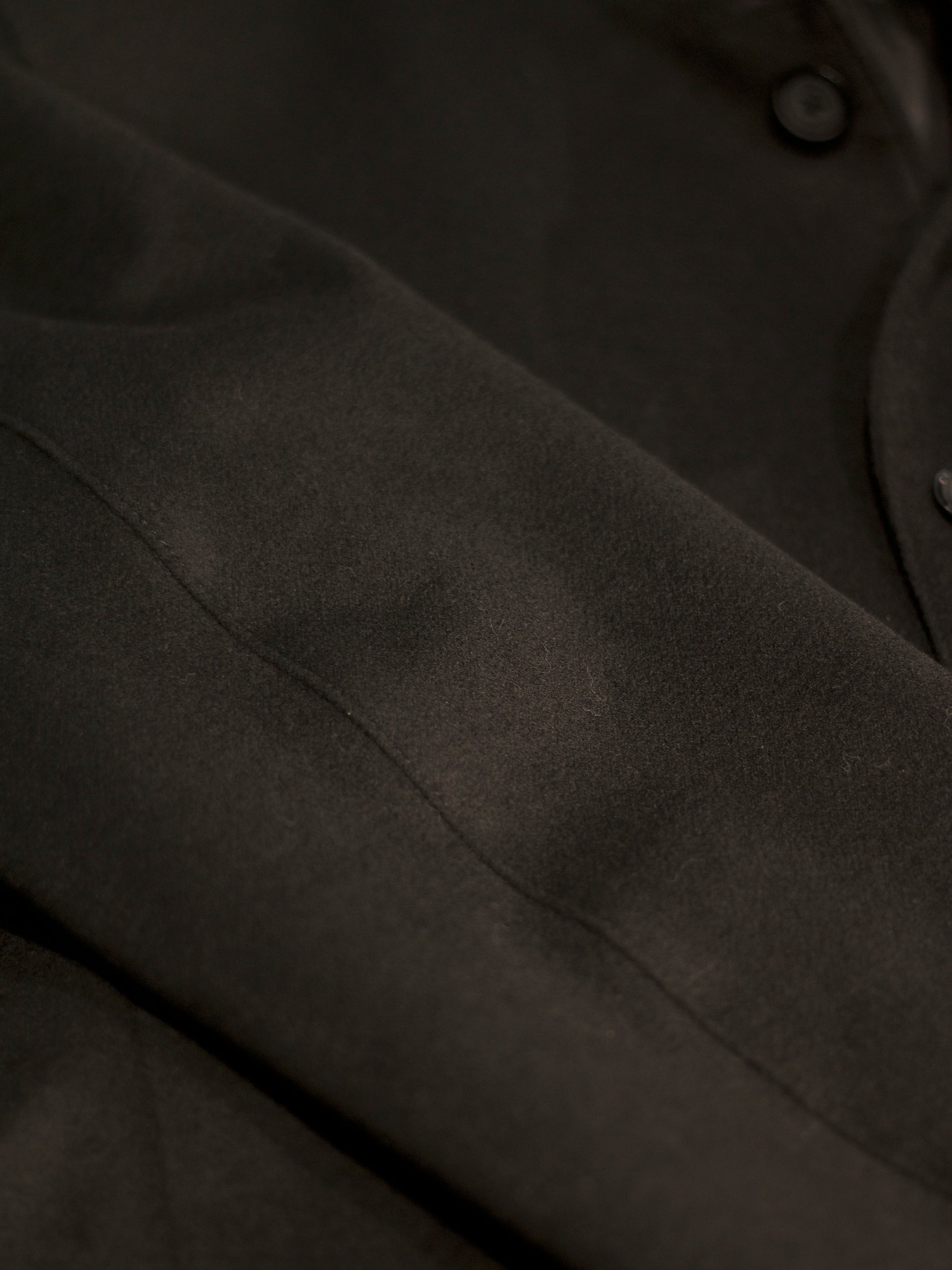 Cut from a 60% cashmere and 40% wool blend, this jacket balances softness with structure. The mandarin collar and button placket define a clean silhouette, while a detachable zip behind the lining allows the piece to shift from dual closure to a pure button front. Subtle stitch lines shape the front for a precise drape, complemented by three vertical lines at the back. Finished with a slightly curved hem and discreet side slit, it moves with ease while retaining a refined architectural form.