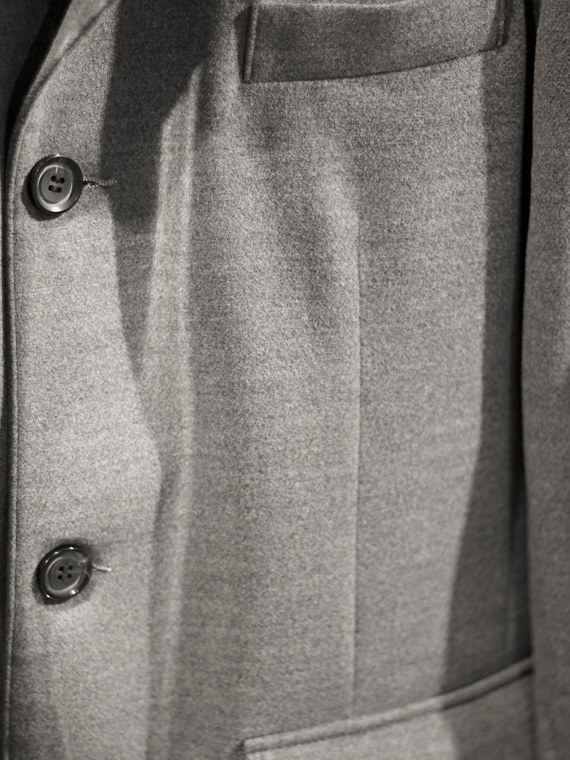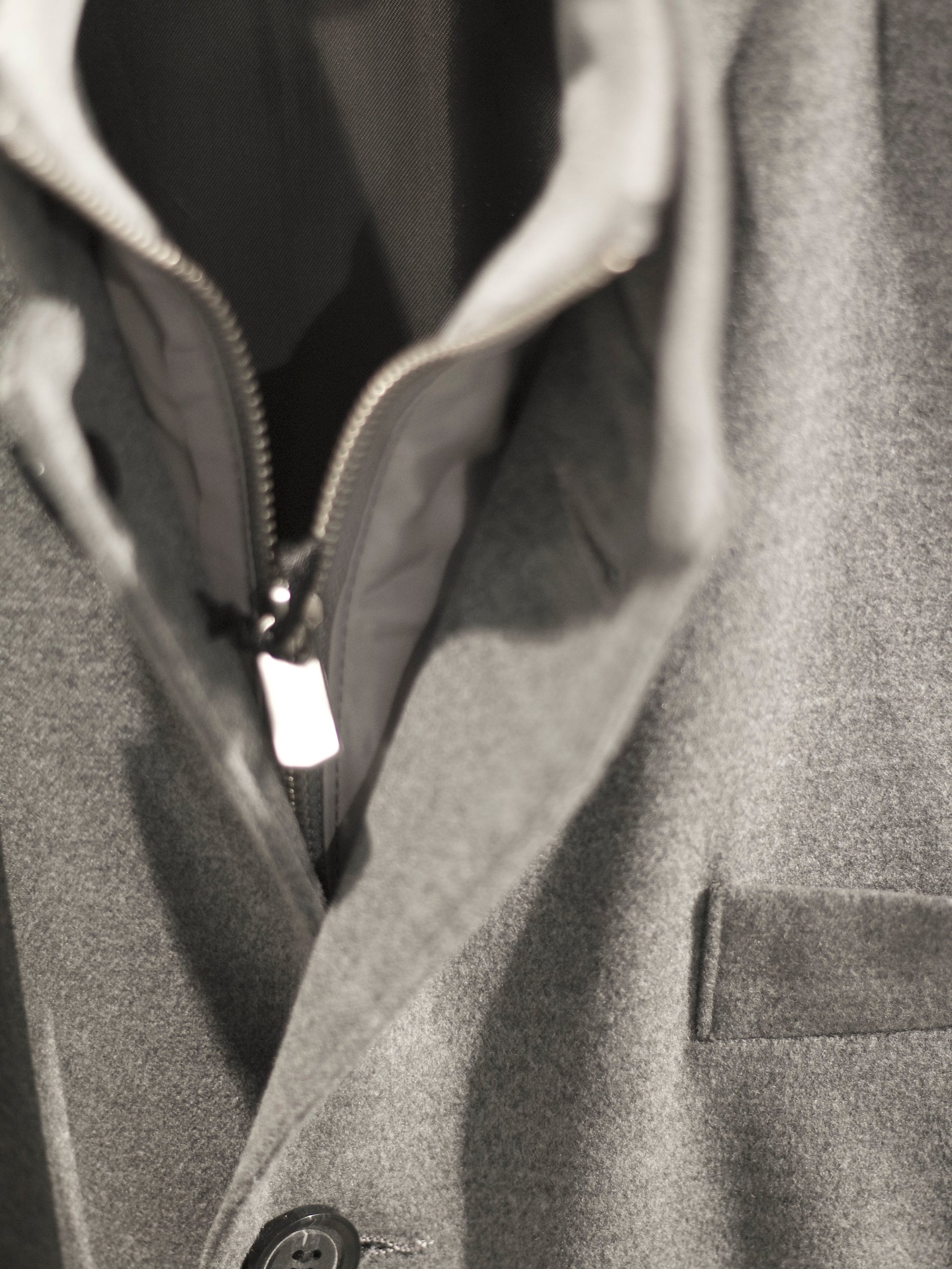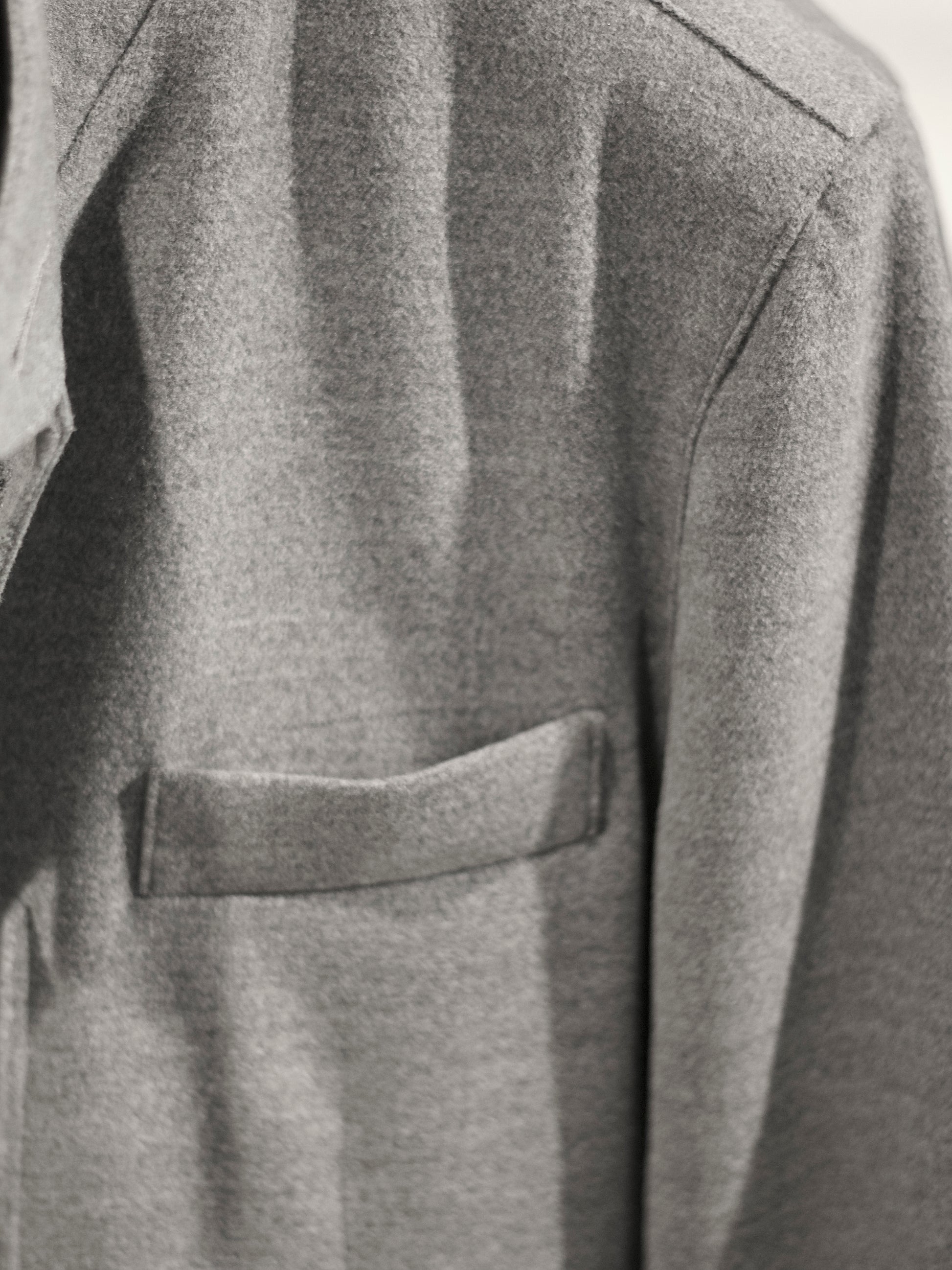 Cut from a 60% cashmere and 40% wool blend, this jacket balances softness with structure. The mandarin collar and button placket define a clean silhouette, while a detachable zip behind the lining allows the piece to shift from dual closure to a pure button front. Subtle stitch lines shape the front for a precise drape, complemented by three vertical lines at the back. Finished with a slightly curved hem and discreet side slit, it moves with ease while retaining a refined architectural form.