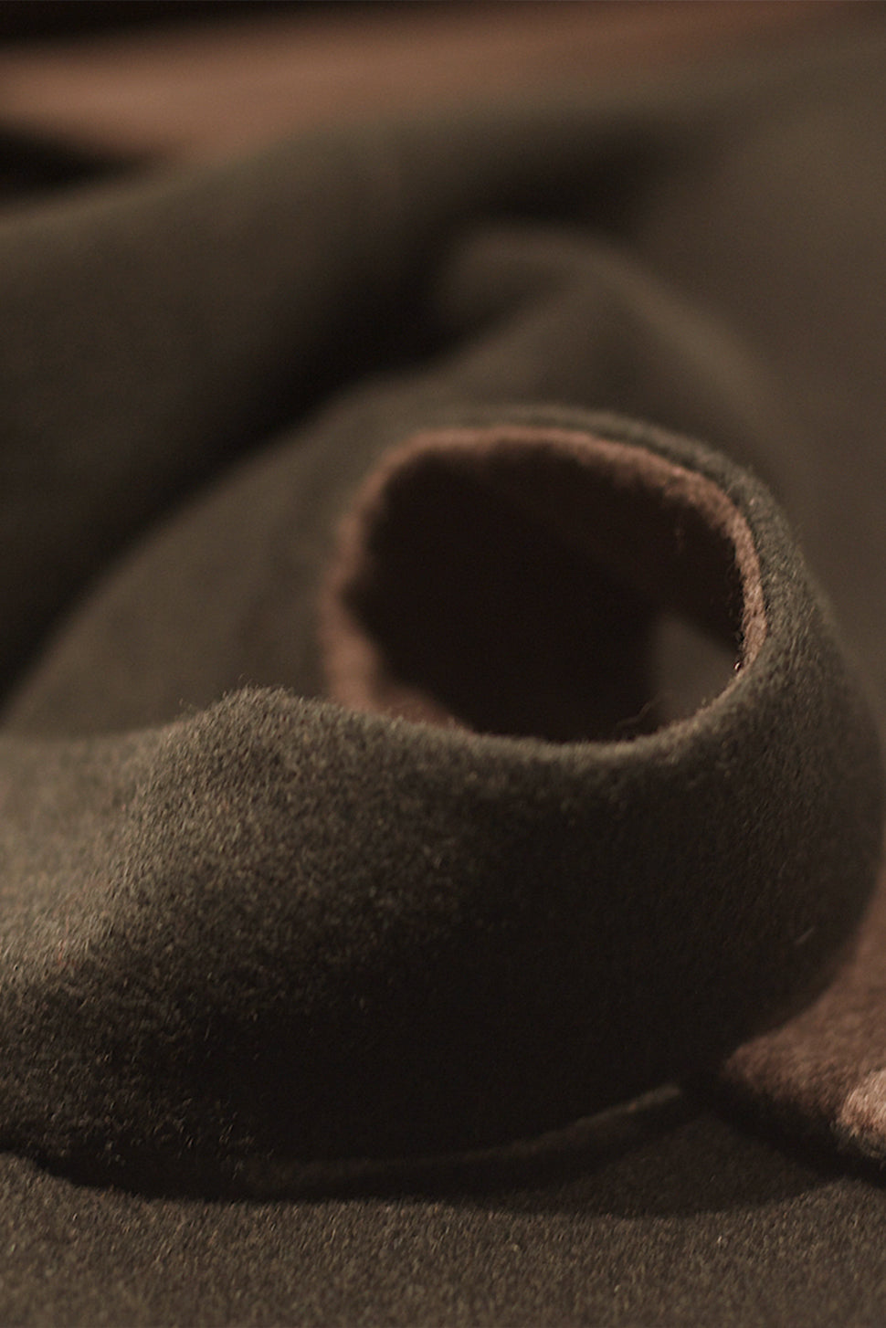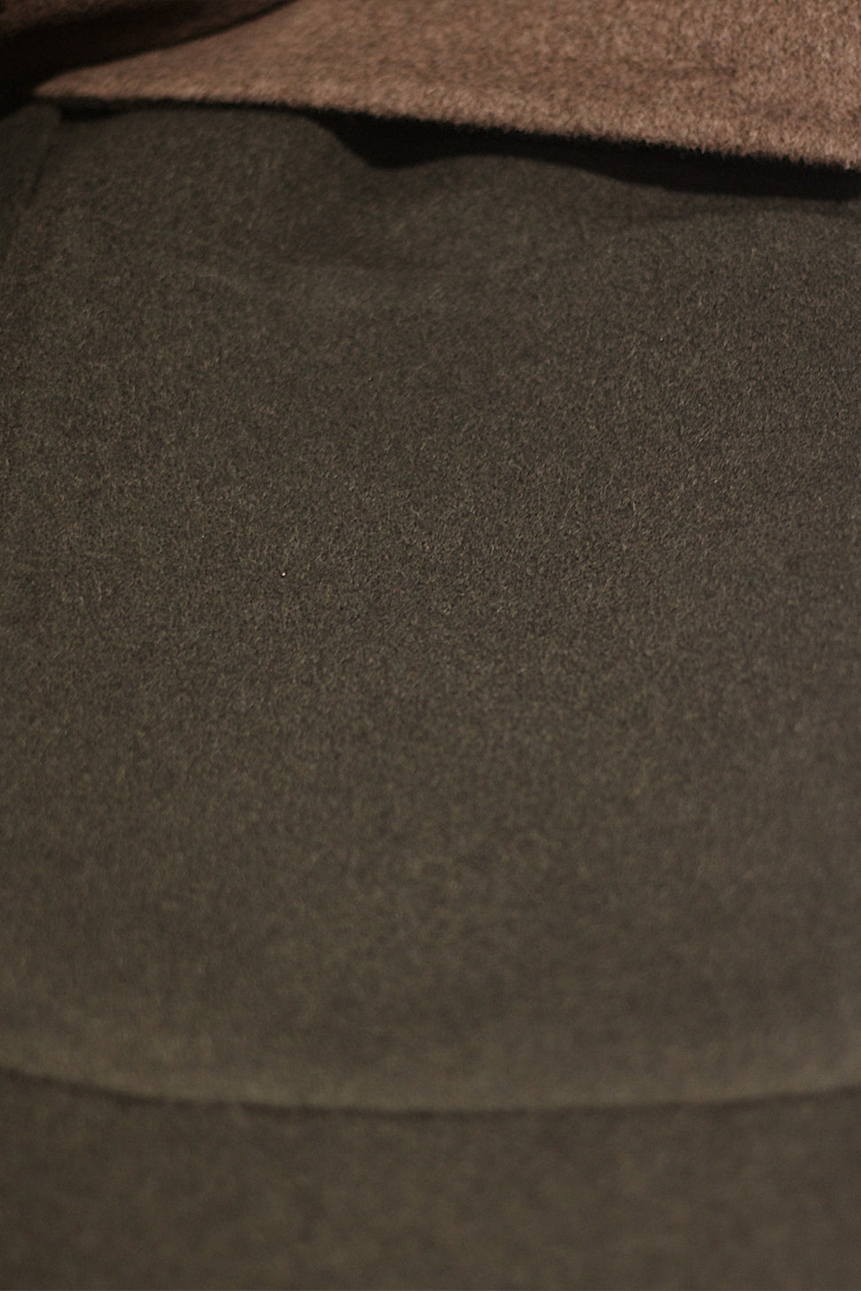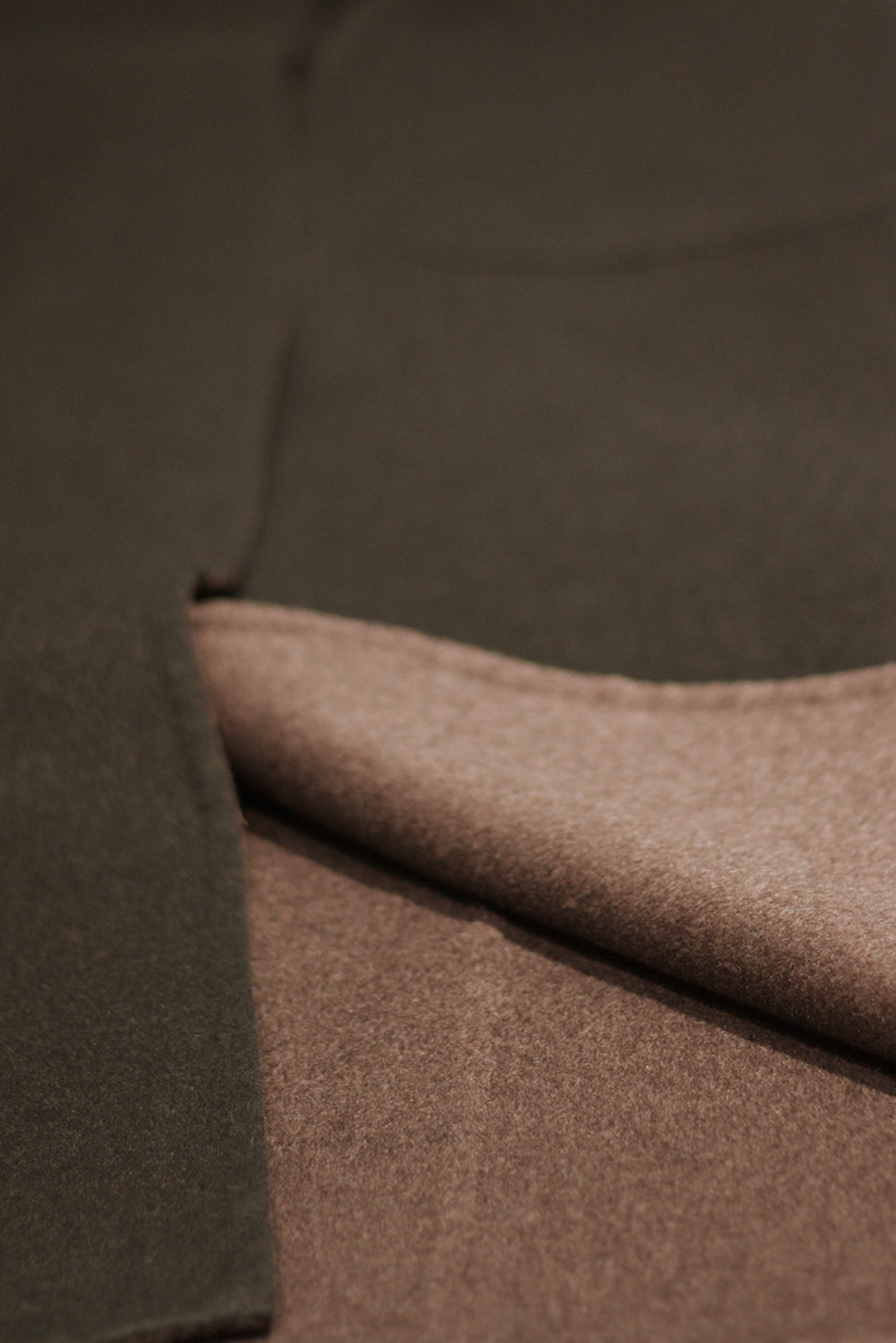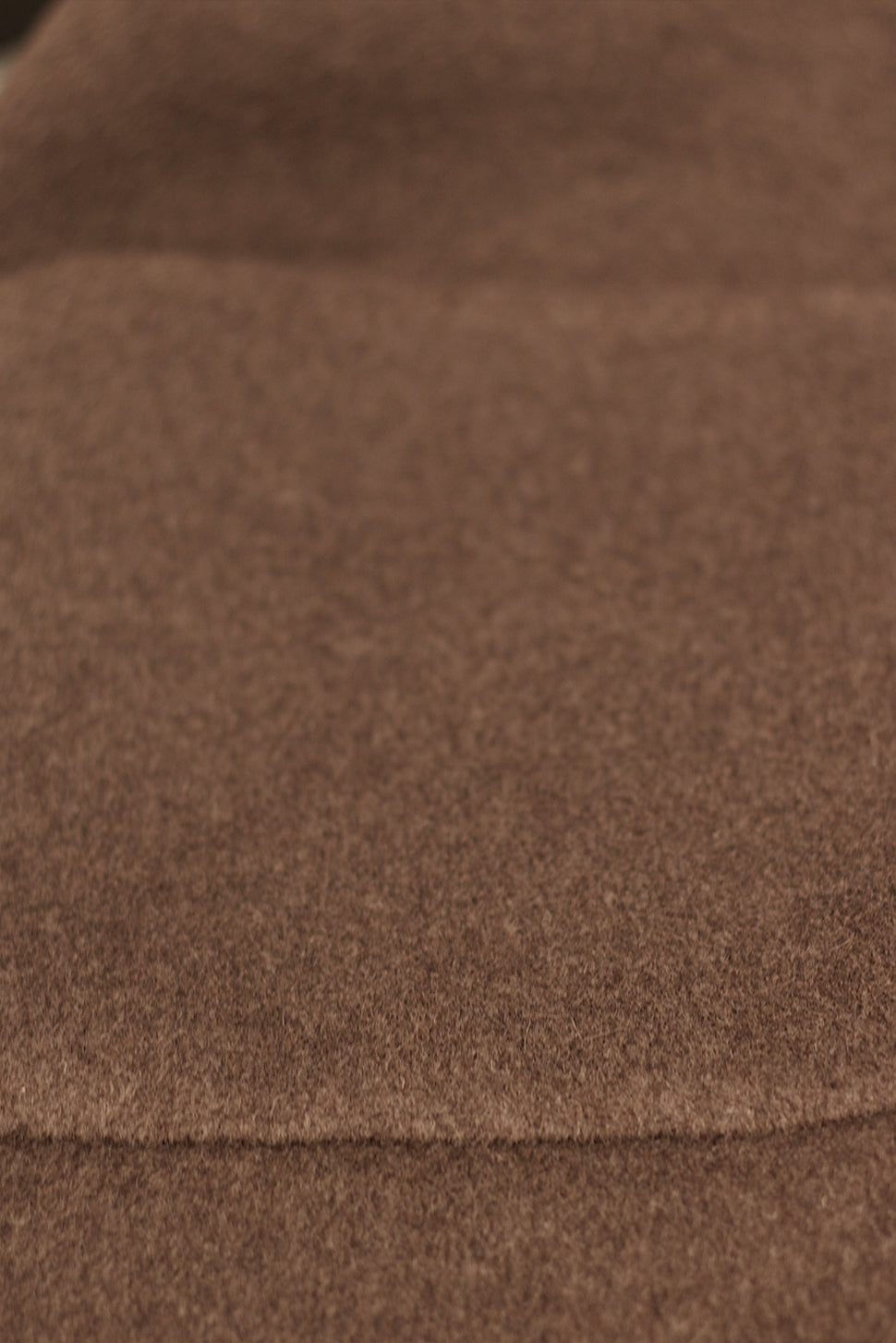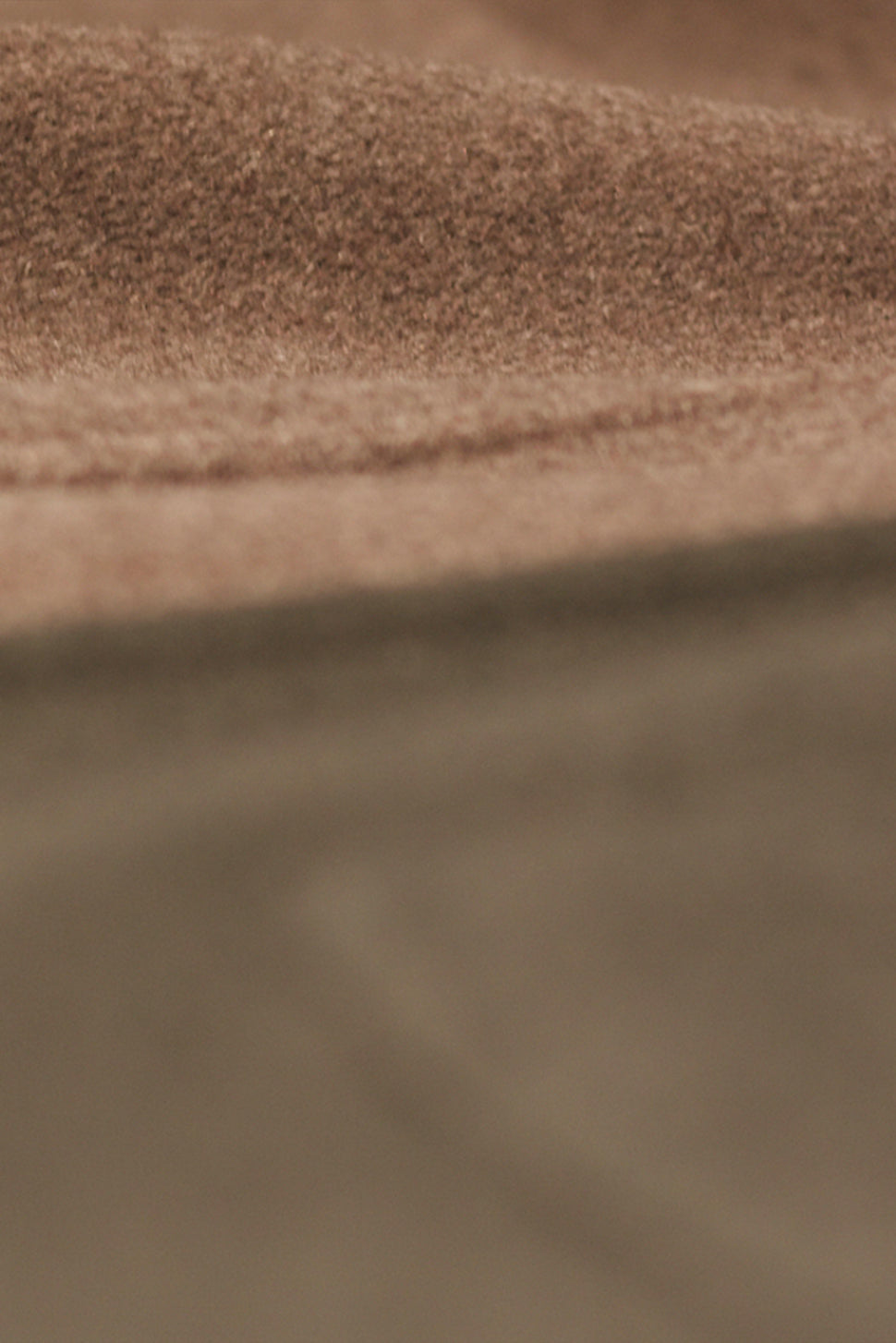 Cut from double-faced 100% cashmere, this belted coat blends warmth with sculpted ease. The outer face carries a muted shade between grey and blue, while the inner surface shifts into a quiet mix of grey and beige, creating subtle depth in tone. A shawl collar frames the neckline with fluid softness, mirrored by a self-tie belt that defines the waist without breaking its relaxed drape. Large patch pockets ground the front, balancing utility with minimal detailing. Designed in a medium weight, it offers exceptional insulation while maintaining a supple, free-flowing structure. Finished with clean edges and a straight hem, the piece embodies understated sophistication with modern versatility.