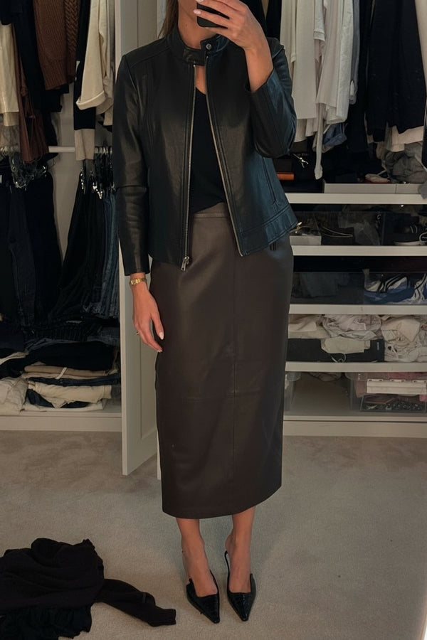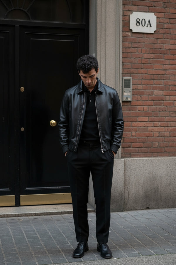 Crafted from double-faced lamb leather, this jacket combines the softness of suede with the sleek finish of smooth leather, offering two distinct textures in one piece; minimal detailing, clean seams, and a straight zip front keep the design refined, while the lightweight construction makes it versatile enough to wear suede-out for a relaxed depth or leather-out for a sharper, polished look.